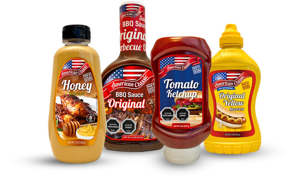 Línea de aderezos tradicionales estadounidenses compuesta por Ketchup, Yellow Mustard, Mostaza Miel y Salsa BBQ, pensada para acompañar preparaciones clásicas con sabores auténticos y una calidad constante.